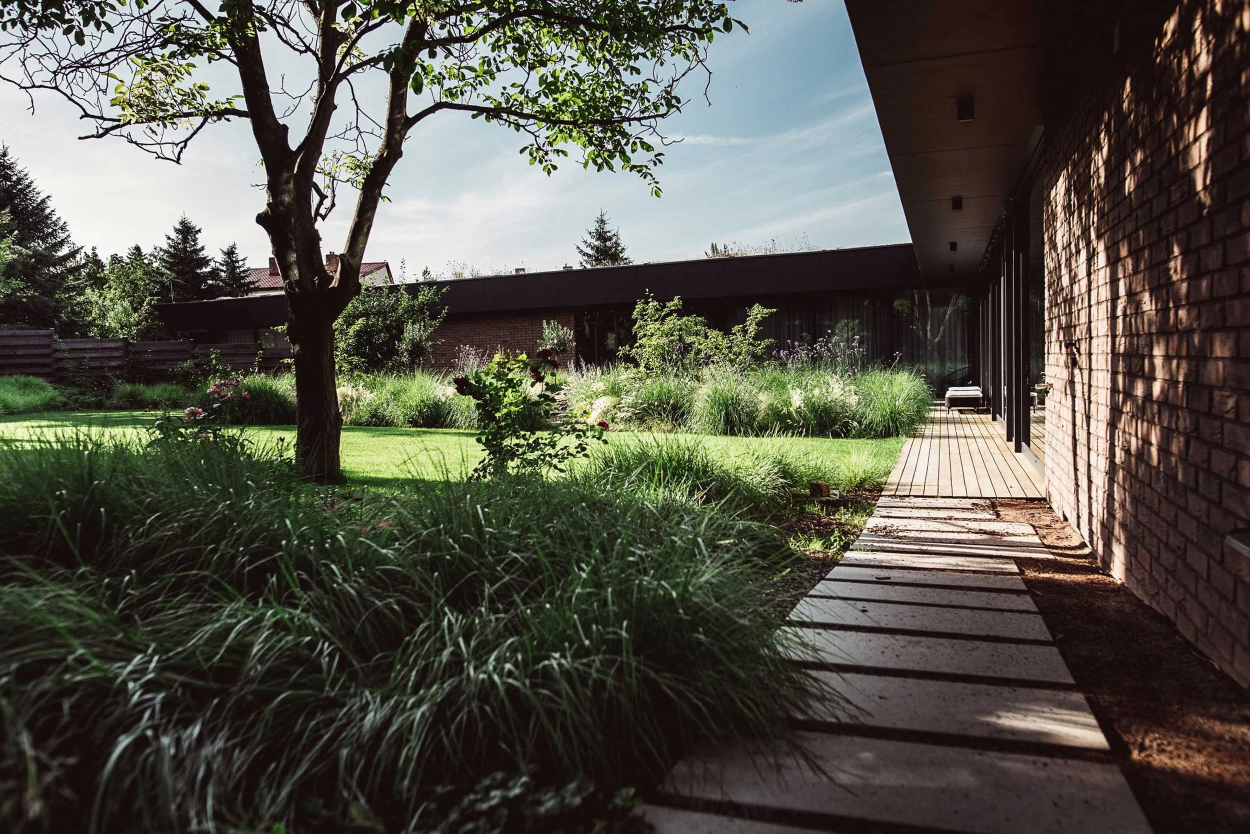 Díky tvaru domu mohl vzniknout prostor s charakterem atria – klidná, částečně uzavřená zahrada, která je vnímána z většiny místností domu. Je to prostor s jasným řádem, ale přitom působí velmi přirozeně. Výsadby tvoří kombinace keřů, travin a nízkých borovic, které se během roku proměňují, ale nikdy na úkor struktury. Mezi nimi září rozchodníky, třapatky nebo dochany, které upoutají pozornost na první pohled. Z každého okna se otevírá jiný úhel pohledu, jako by zahrada pokaždé vyprávěla trochu jiný příběh.