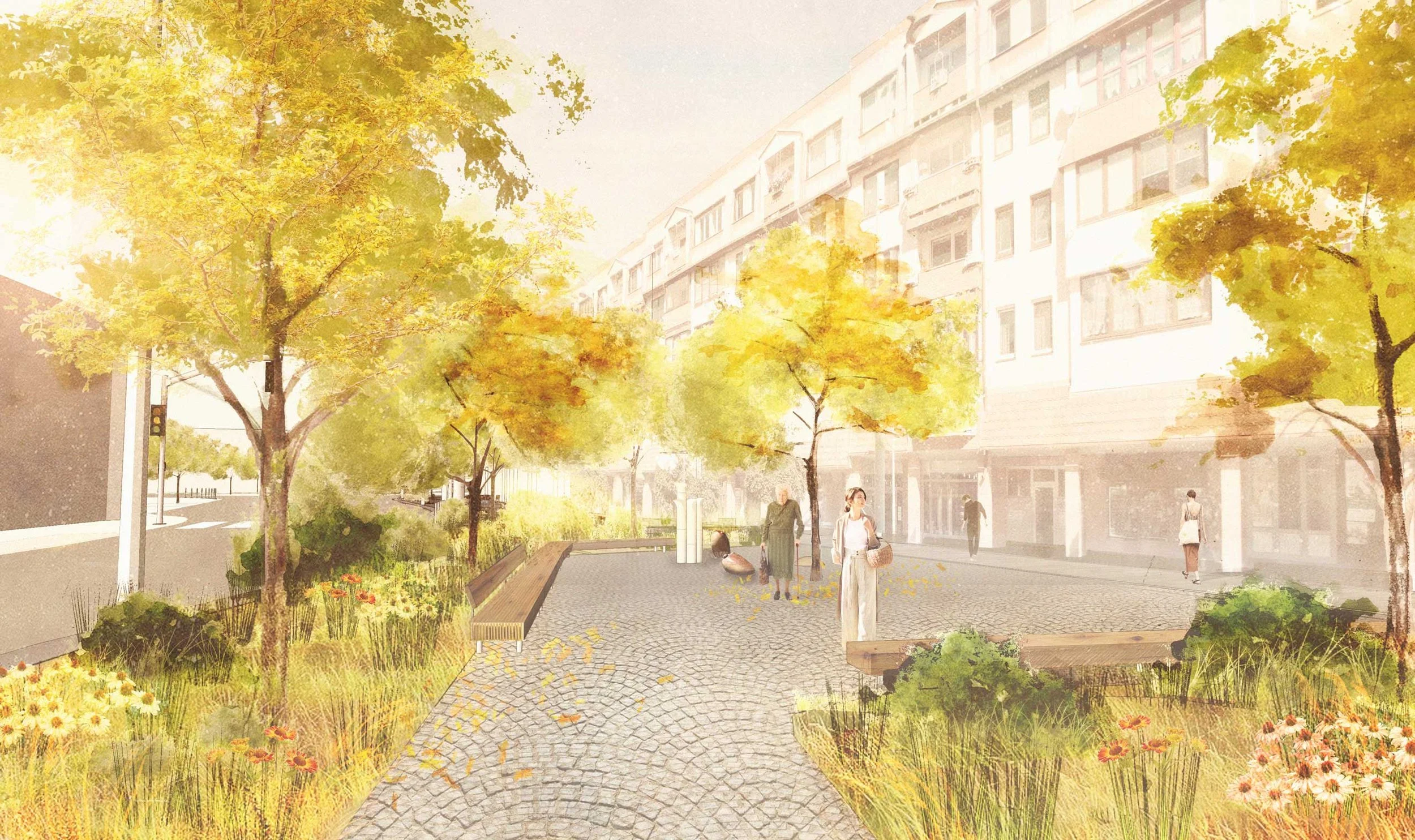 [01] Návrh řeší širší souvislosti Křižíkova náměstí a napojuje se pomocí velkoformátové dlažby na Třídu 9. května. Vytváří jasně vymezený pěší koridor. Povrch pro pohodlnou rychlou chůzi i jízdu kočárkem. Na koridor jsou navázána útulná pobytová místa, podpořená “zpomalovací“ dlažbou tvořenou štípanou kamennou dlažbou.