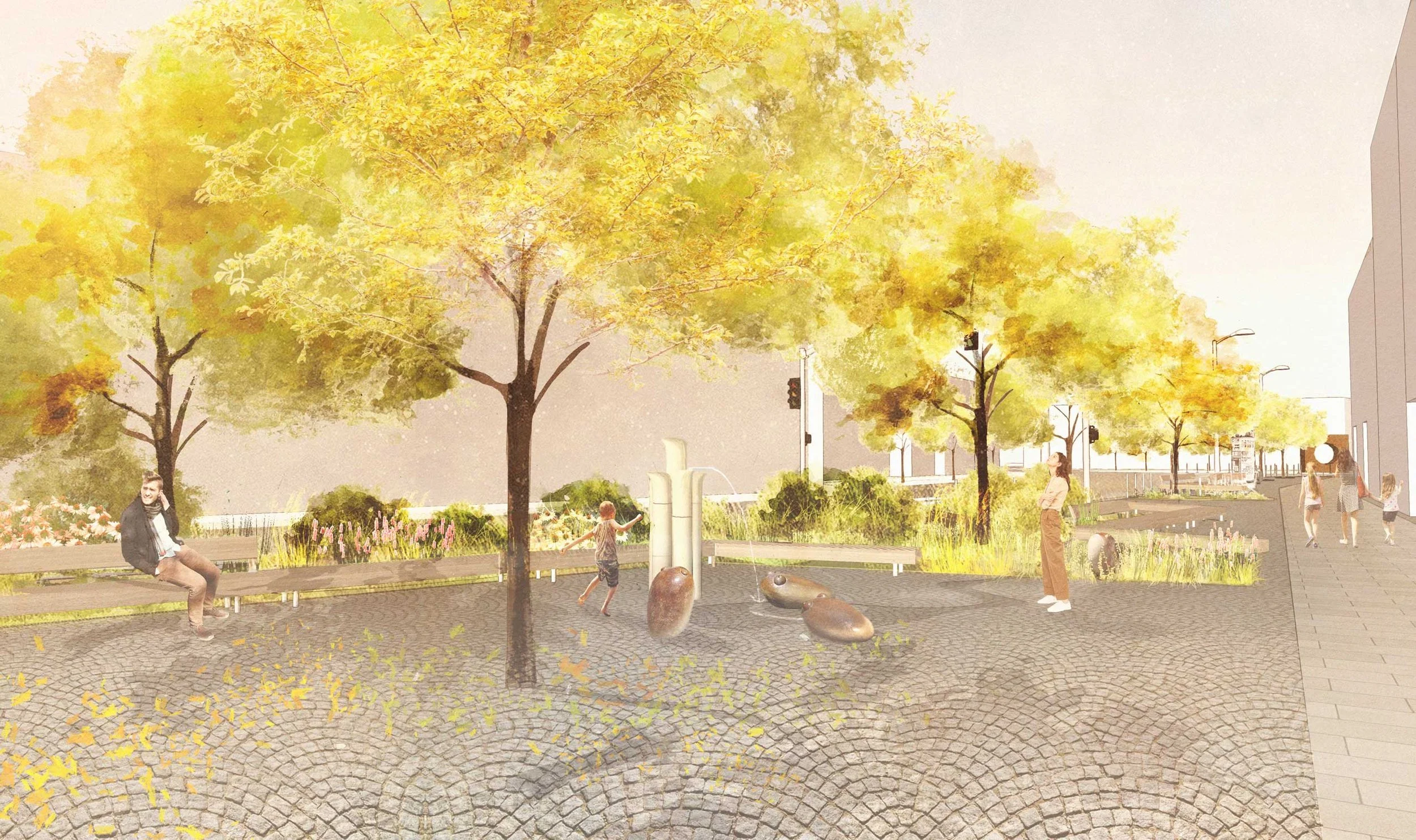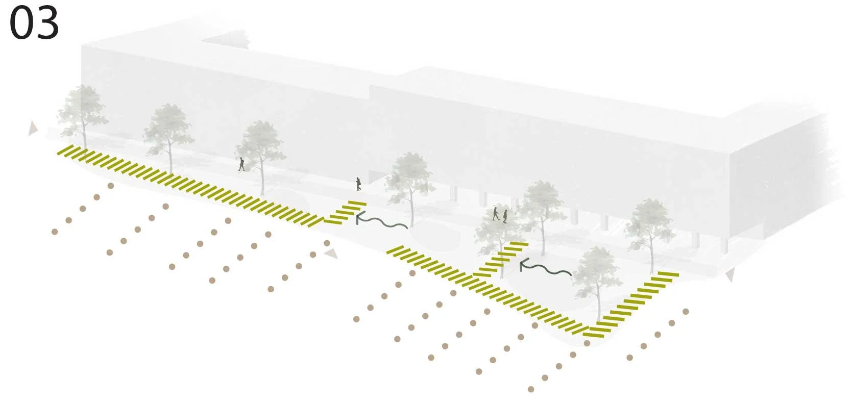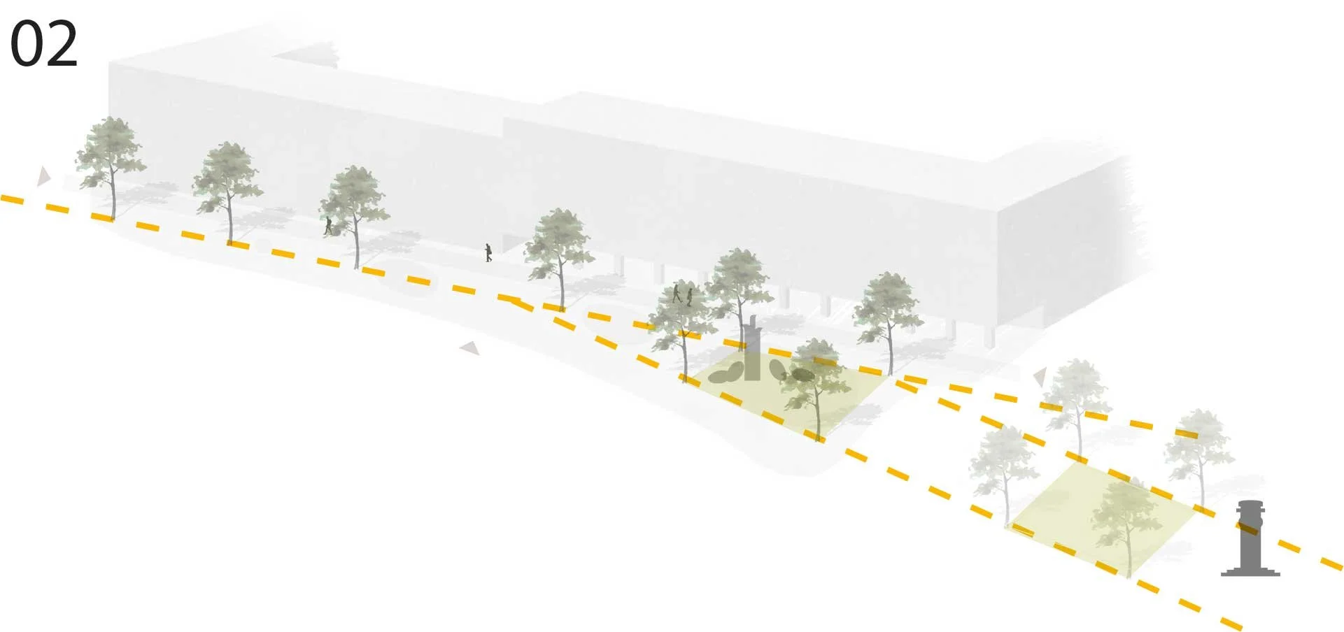 [02] Návaznost na okolí řeší návrh také prostřednictvím hlavních os, které vychází z urbanistické struktury Křižíkova náměstí. Umístění stromů na hlavních osách a umístění do rastru, který tvoří zelenou klembu pobytových míst. Plocha se zastíní, zkvalitní se mikroklima. [03] Zelené záhony ochlazují prostor z jihu, cloní silnici a zachytávají prach. Zeleň bude navíc zachytávat dešťovou vodu a zajišťovat částečně přirozený vsak, což výrazně zlepšuje adaptaci městské zóny na klimatickou změnu.