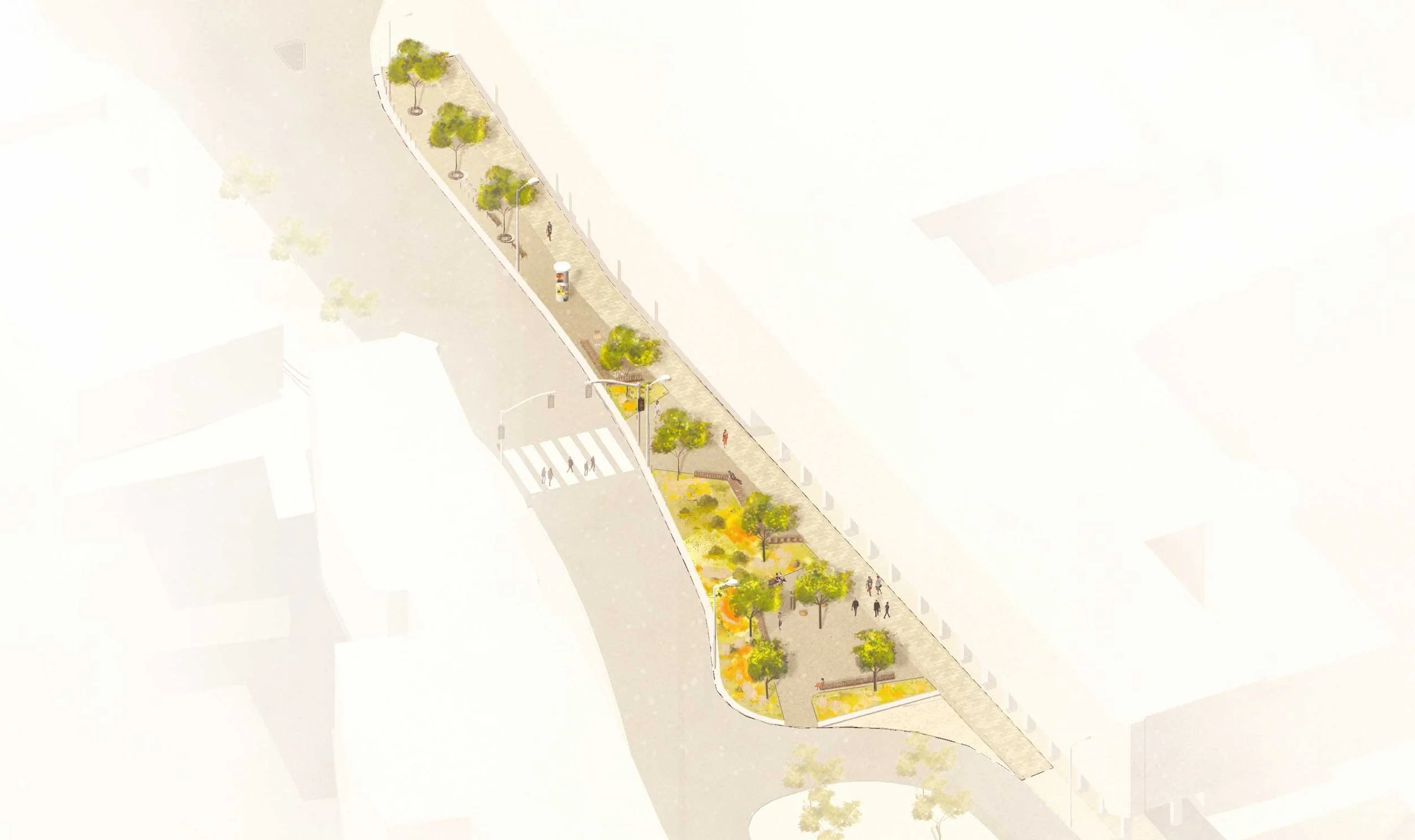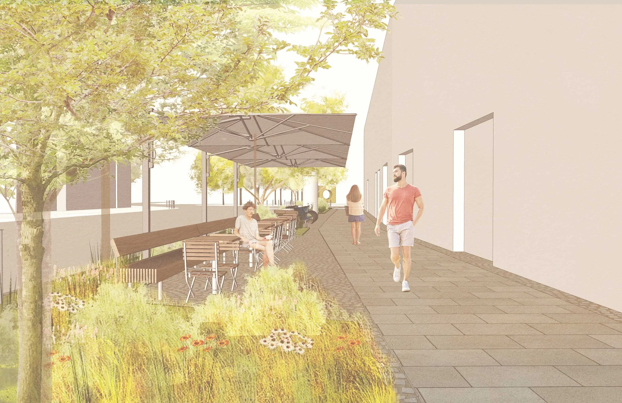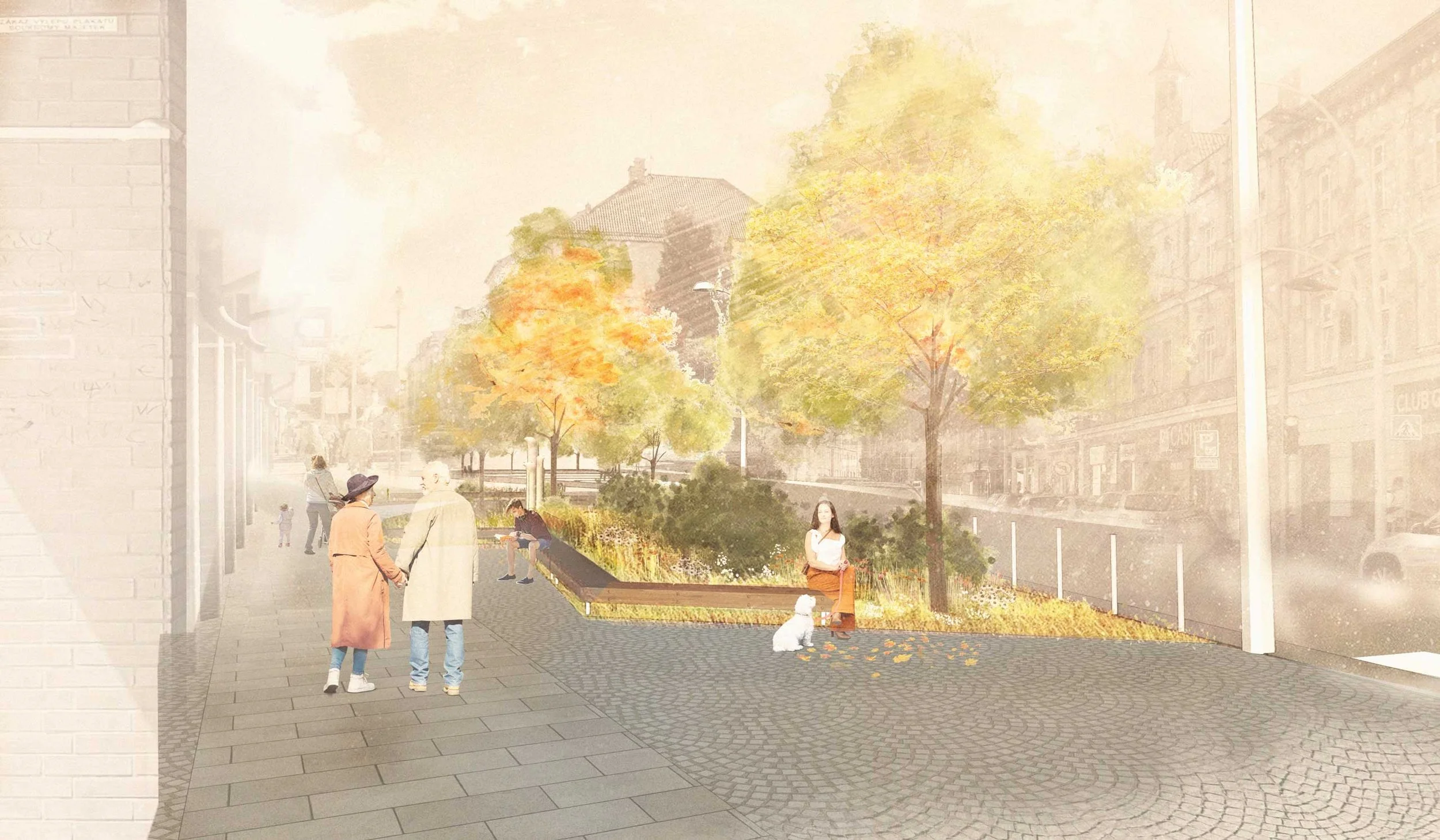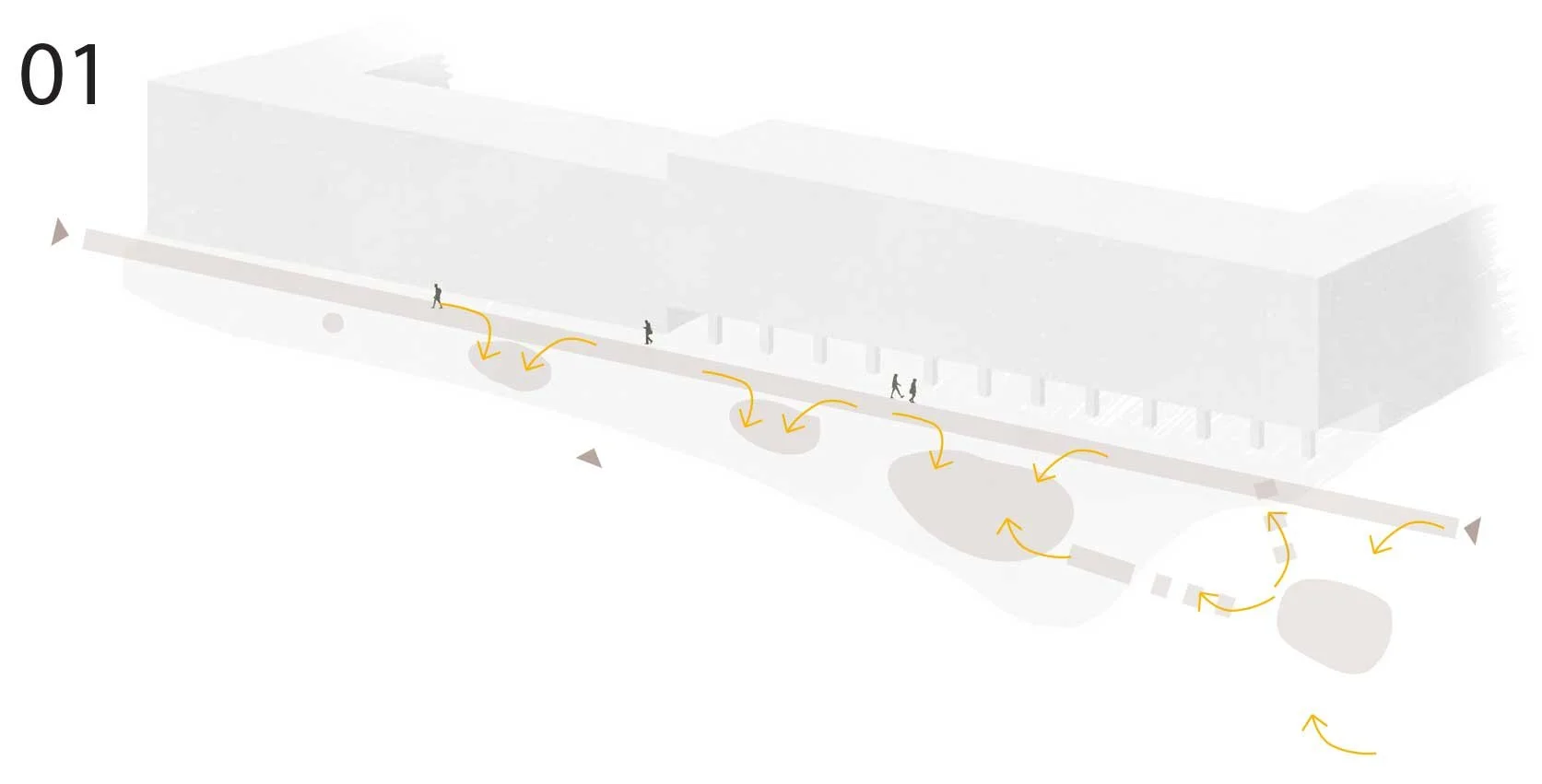 [02] Návaznost na okolí řeší návrh také prostřednictvím hlavních os, které vychází z urbanistické struktury Křižíkova náměstí. Umístění stromů na hlavních osách a umístění do rastru, který tvoří zelenou klembu pobytových míst. Plocha se zastíní, zkvalitní se mikroklima. [03] Zelené záhony ochlazují prostor z jihu, cloní silnici a zachytávají prach. Zeleň bude navíc zachytávat dešťovou vodu a zajišťovat částečně přirozený vsak, což výrazně zlepšuje adaptaci městské zóny na klimatickou změnu.