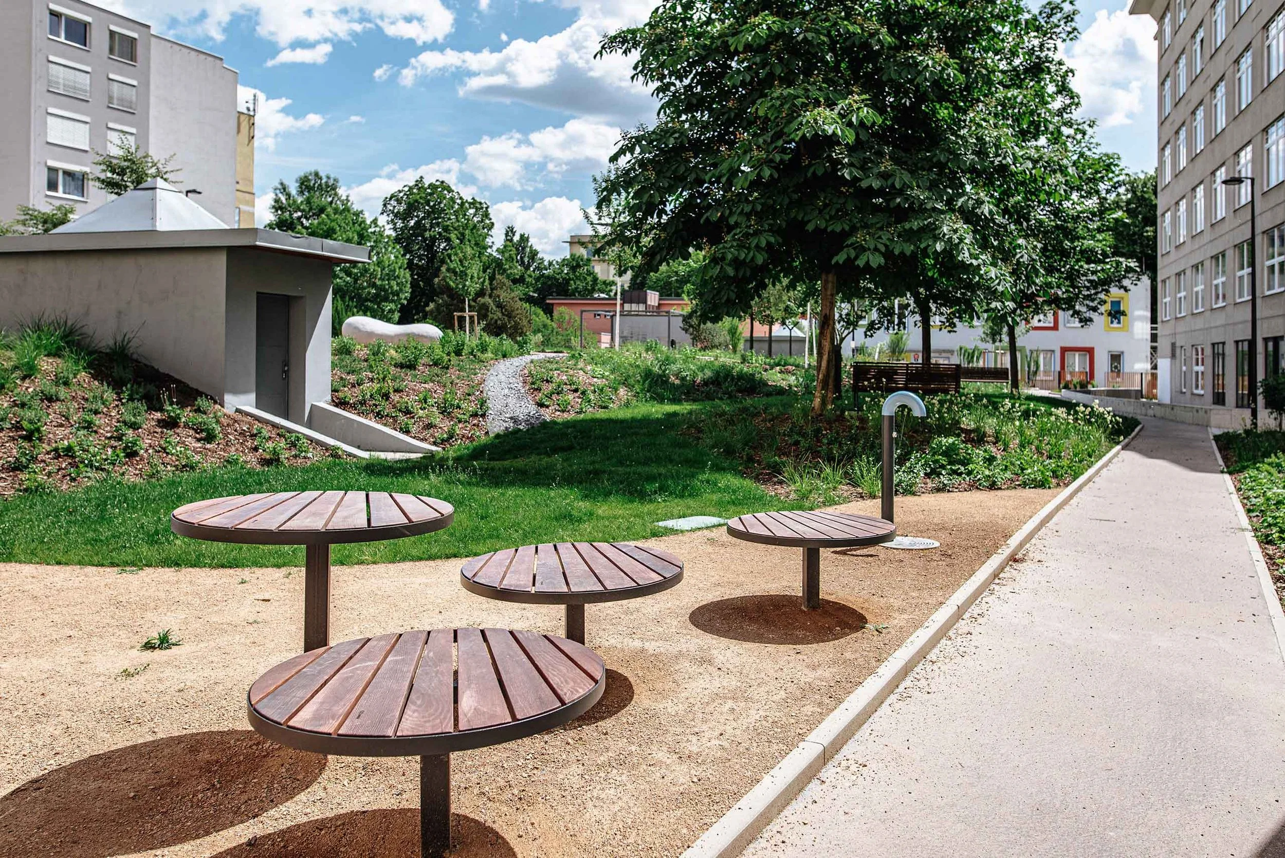 Projekt kladl důraz na principy modrozelené infrastruktury, tedy udržitelné hospodaření s vodou a zlepšení mikroklimatu. Terénní modelace a nově vybudovaná dešťová zahrada přispívají k efektivnímu zadržení srážkové vody přímo na místě. Výběr rostlin zohledňuje místní podmínky a podporuje dlouhodobou udržitelnost.